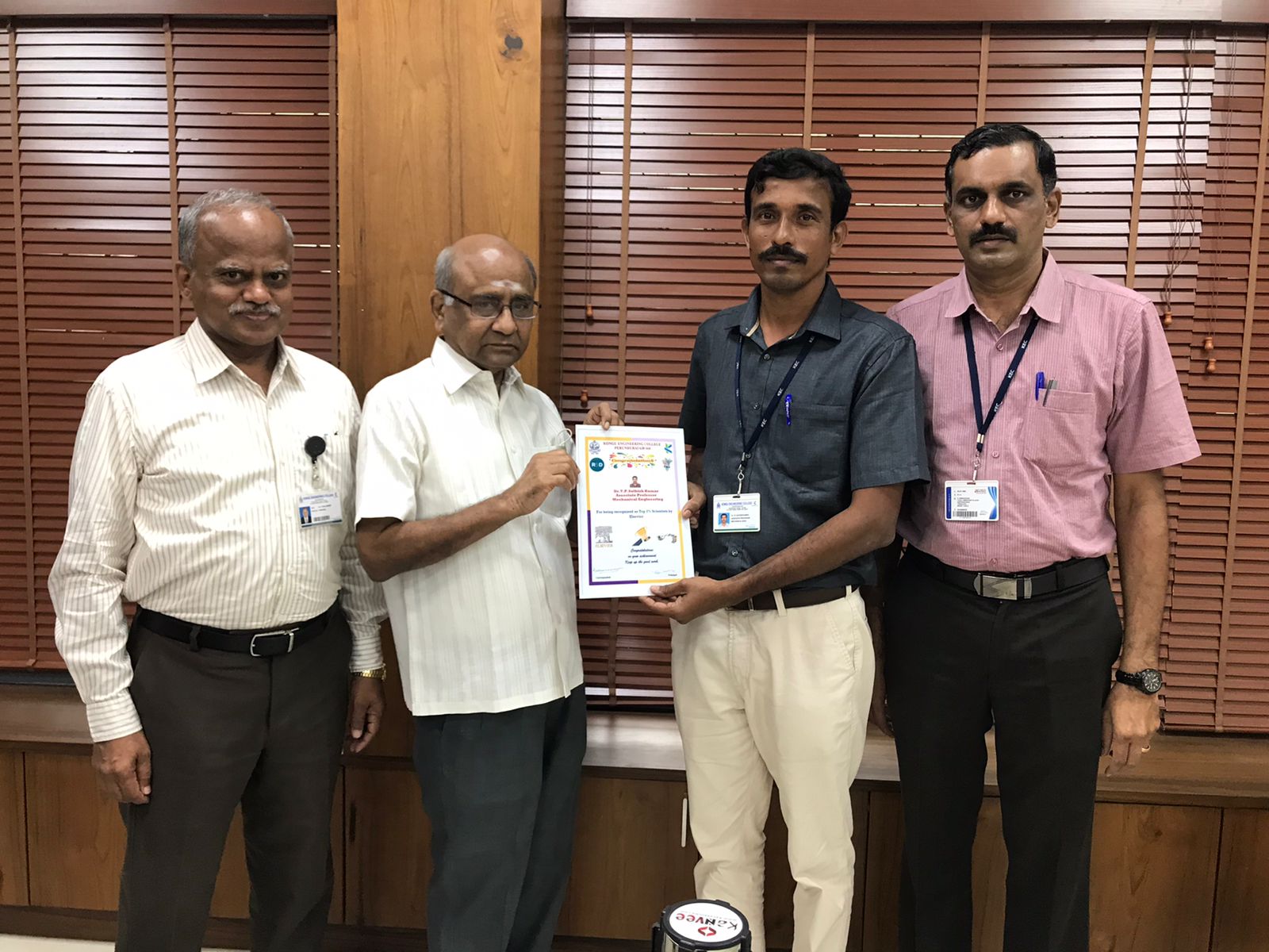 Dr.T.P.Sathish Kumar - Mechanical Engineering of KEC Listed among the Top Indian Researchers in Worldwide Scientists Database 2021 -