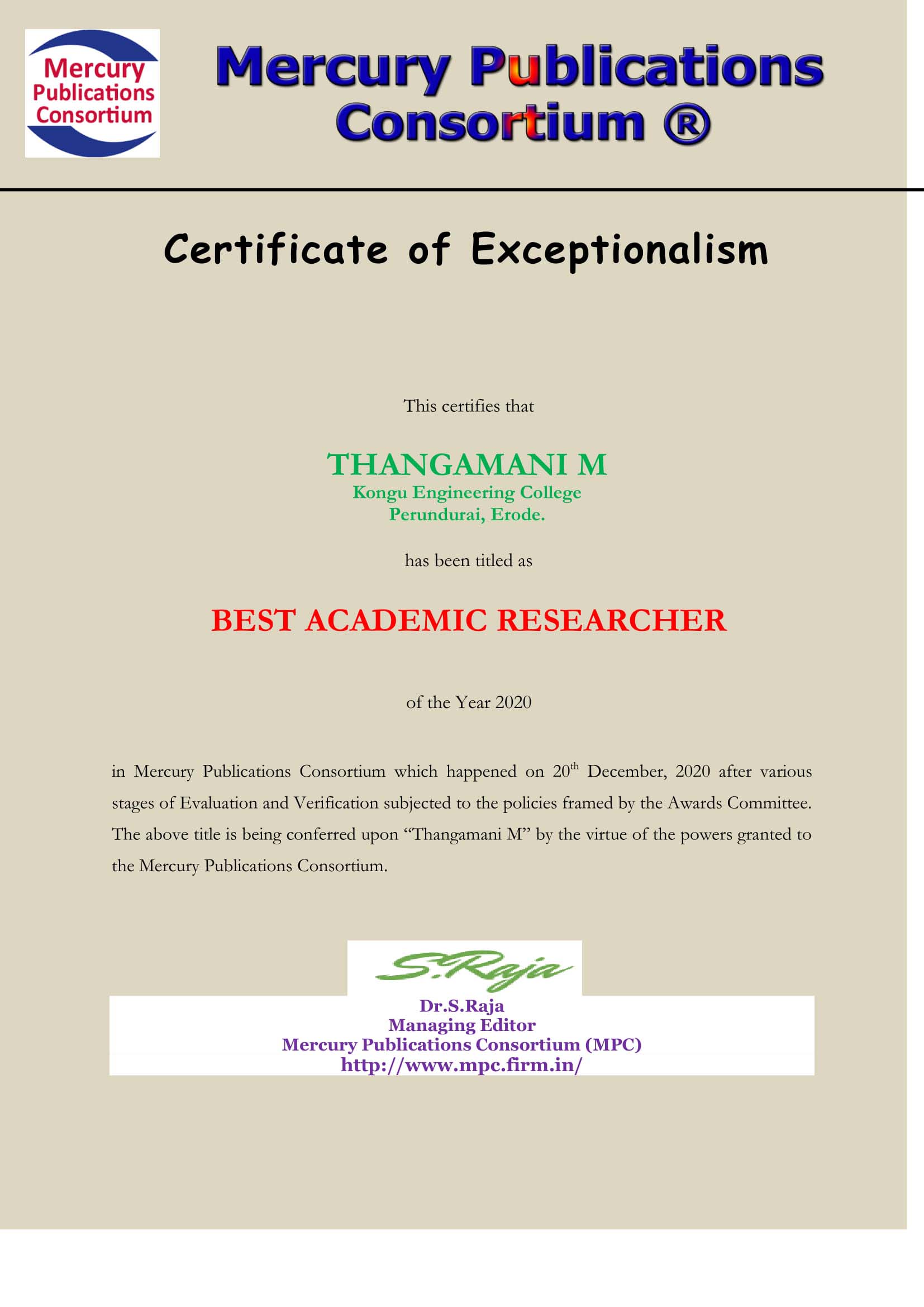 | Received Best Academic Researcher award from Mercury publications Consortium - 20.12.2020