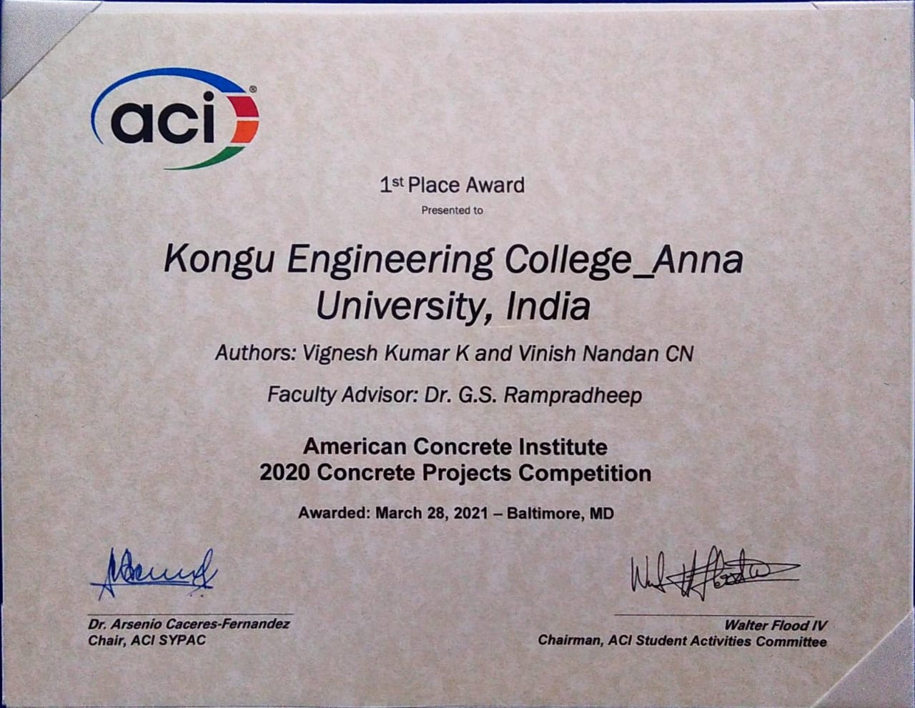 Dr.G.S.Rampradheep received 2020 Concrete Projects Competition Award Winner from ACI USA - 28.03.2020