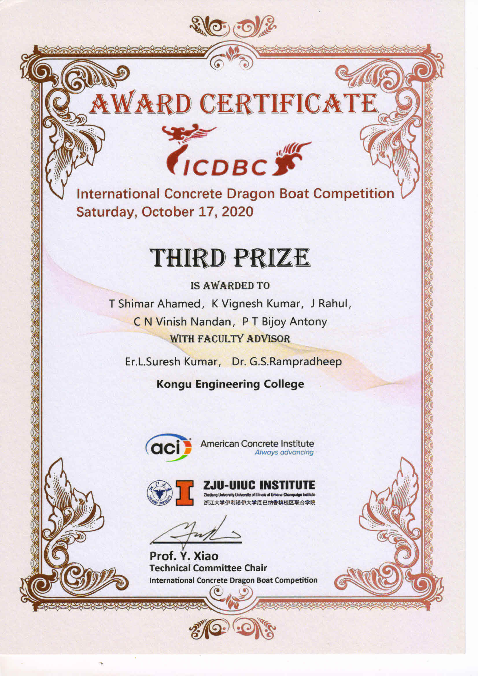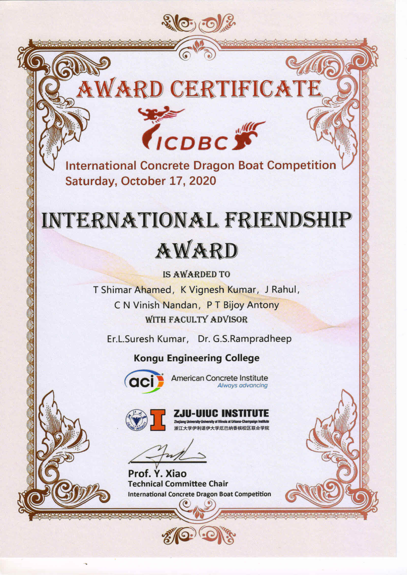 Dr.G.S.Rampradheep and his students team received International Friendship Award in International Concrete Dragon Boat Competition 2020 hosted by Zhejiang University, China in collaboration with University of Illinois UC USA - 17.10.2020