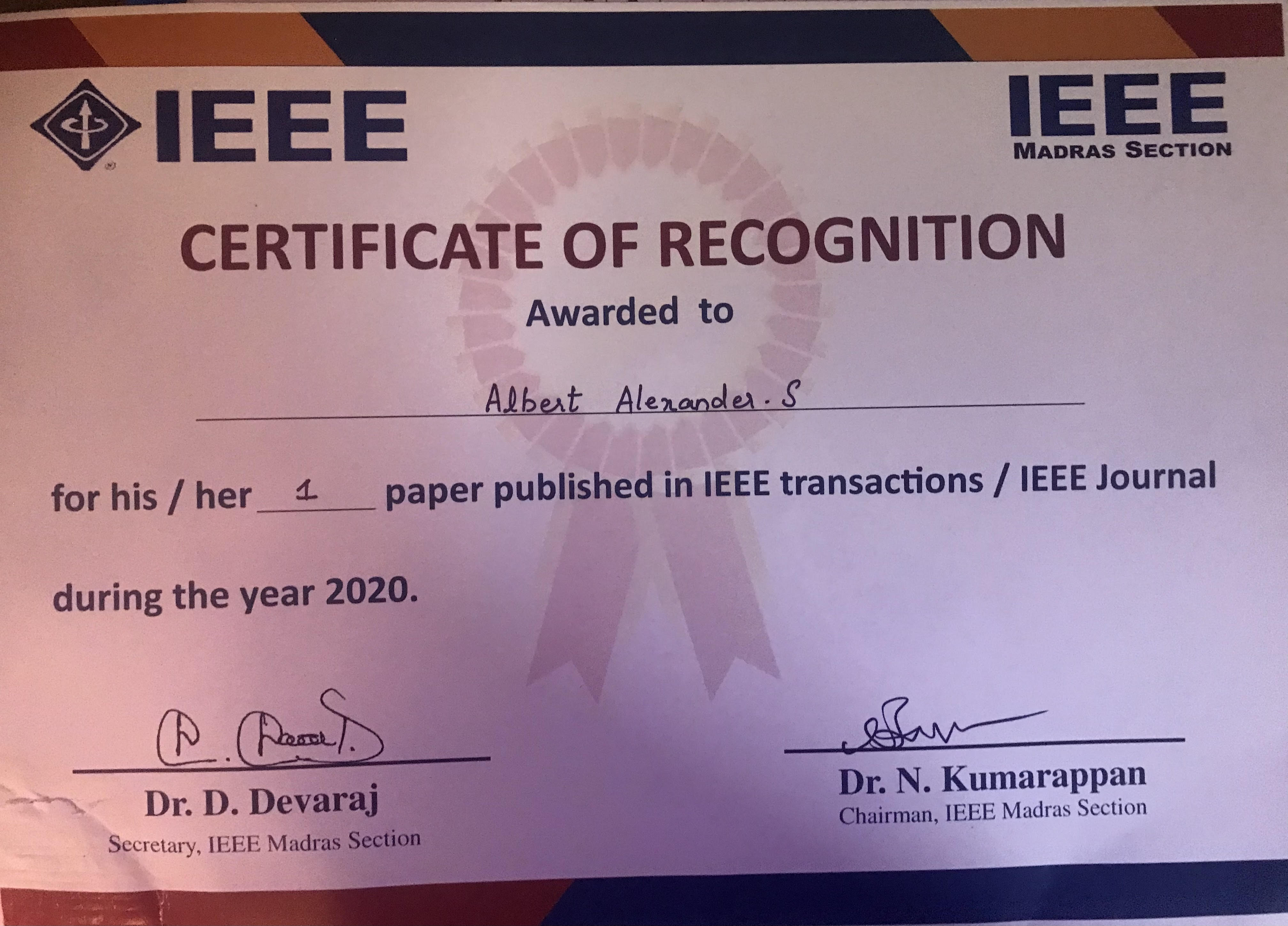 | Received Certificate of Recognition from IEEE - 16.12.2020