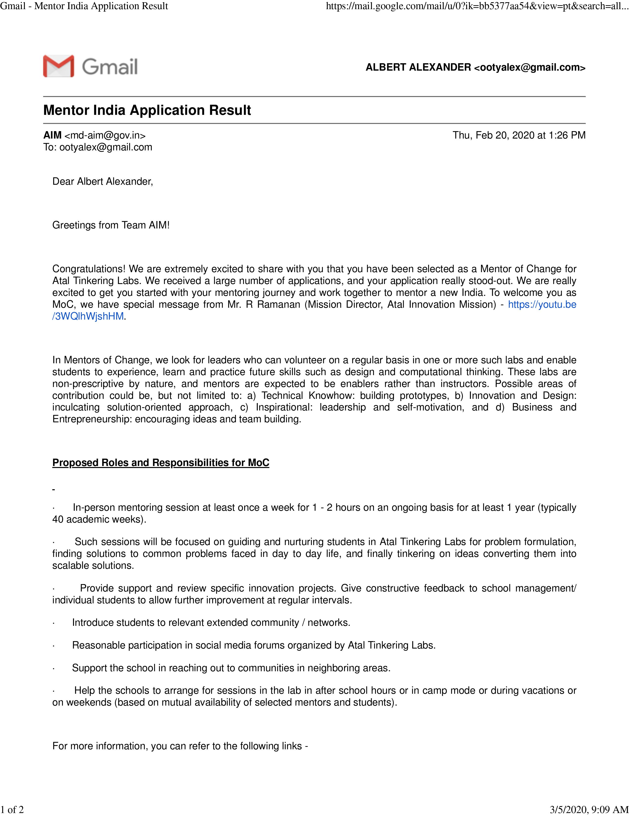 Recognized as MENTOR FOR CHANGE from ATAL INNOVATION MISSION - 20.02.2020