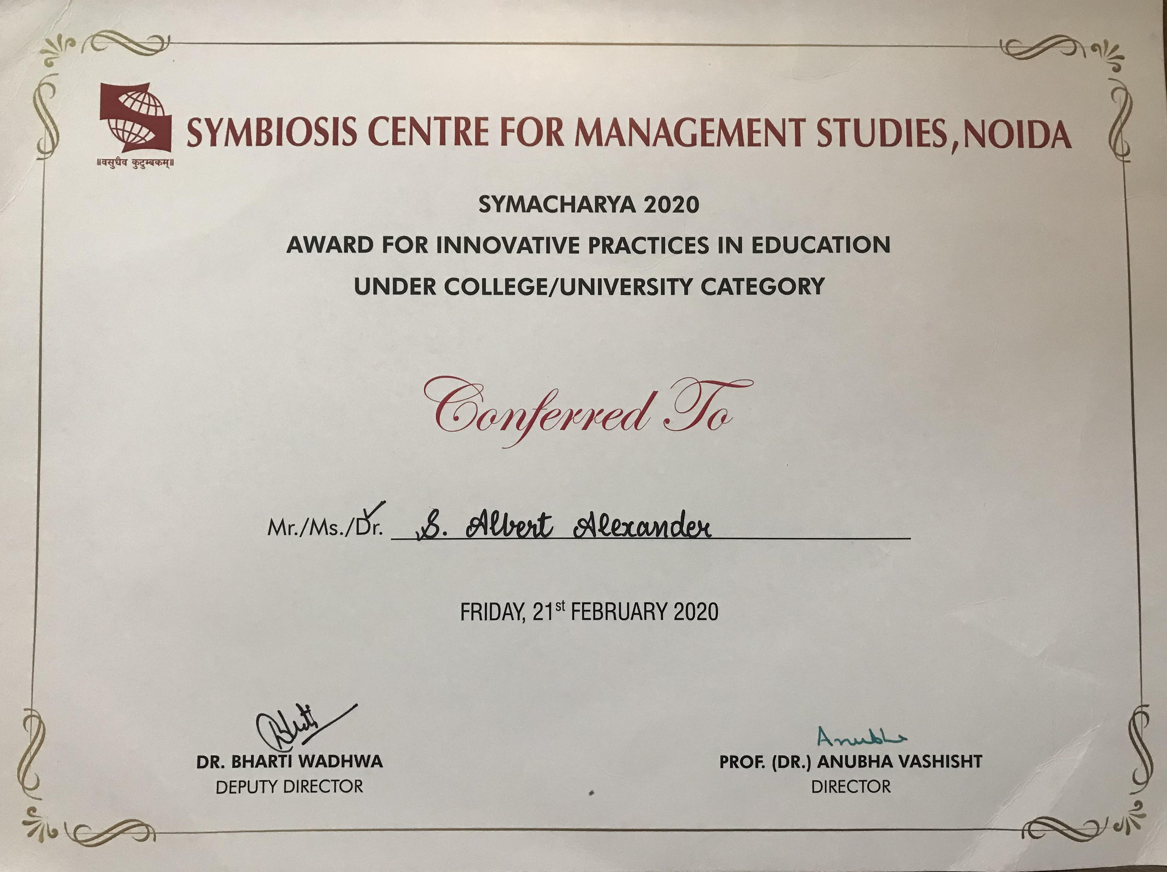 | Received SYMACHARYA award from Symbiosis Centre for Management Studies, Noida - 21.02.2020