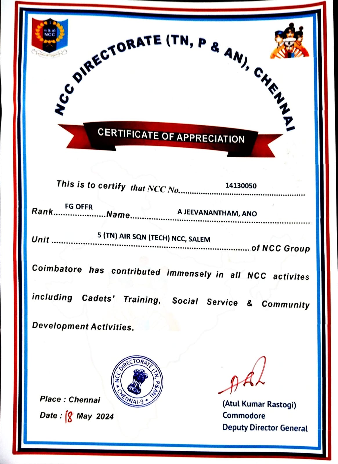 | Flg Offr. A.Jeevanantham received DDG (Deputy Director General) Appreciation Card-2024 -