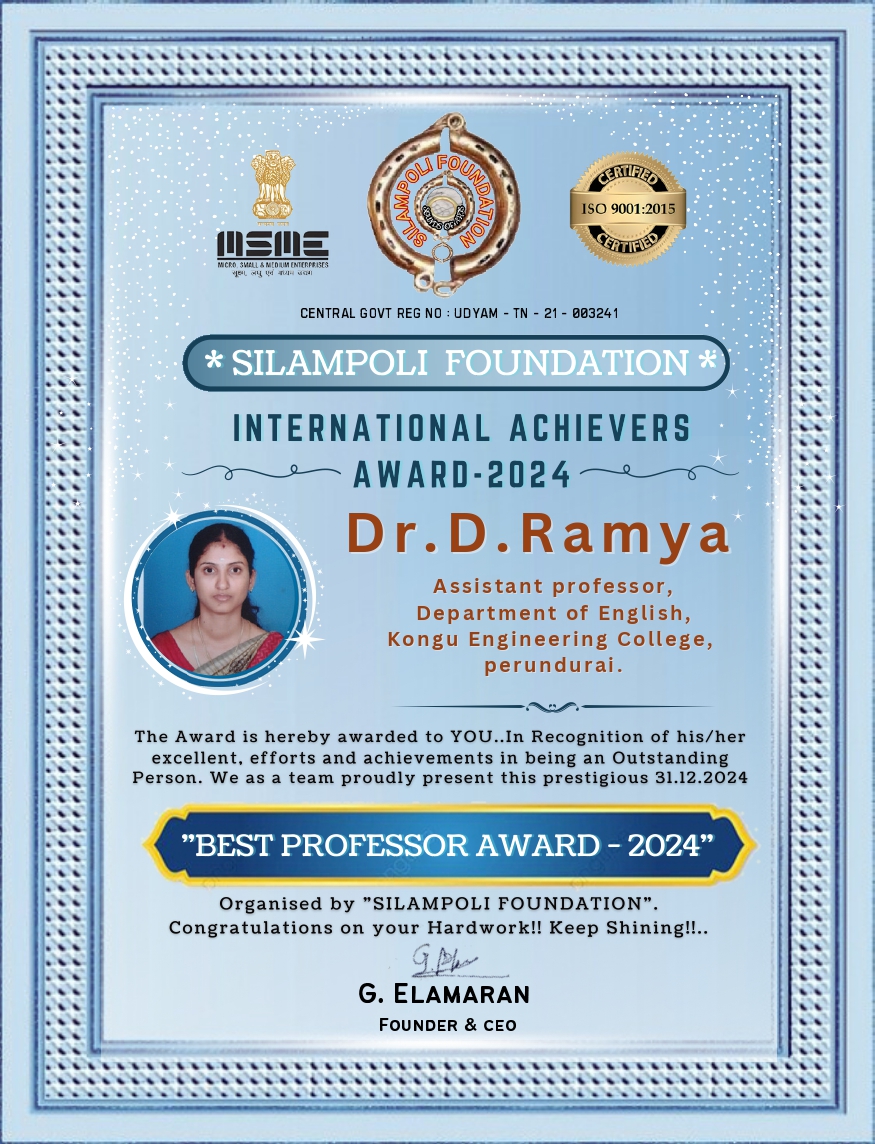 | Dr.D.ramya(English) received Best Professor Award - 2024 by Silampoli Foundation -