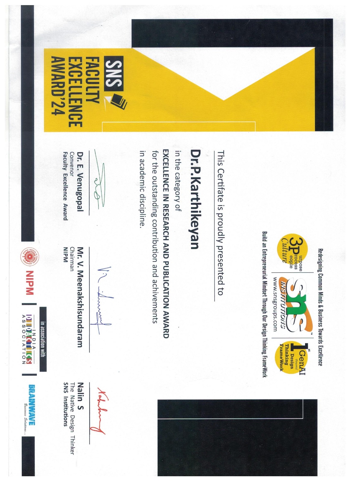 | Dr.P.Karthikeyan(MBA) received Best Faculty award in Excellence in Research and Publication-2024 -